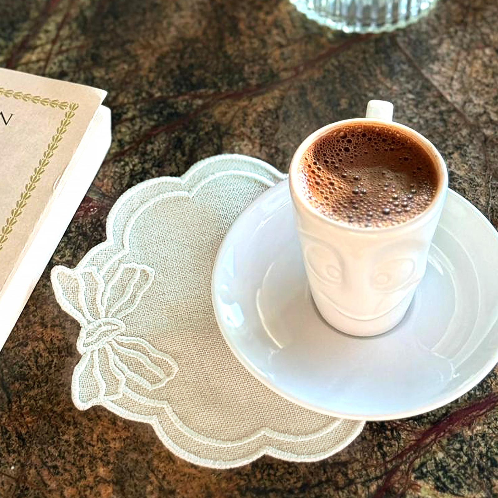 Bu kapiçino fiyonk desenli keten Amerikan servis, sadece bir sofra ürünü değil, aynı zamanda yaşam alanlarına estetik bir dokunuş sunan bir dekoratif detaydır. Masalarınıza zarafet, konfor ve şıklık eklemek istiyorsanız, bu tasarım ideal tercihiniz olur.