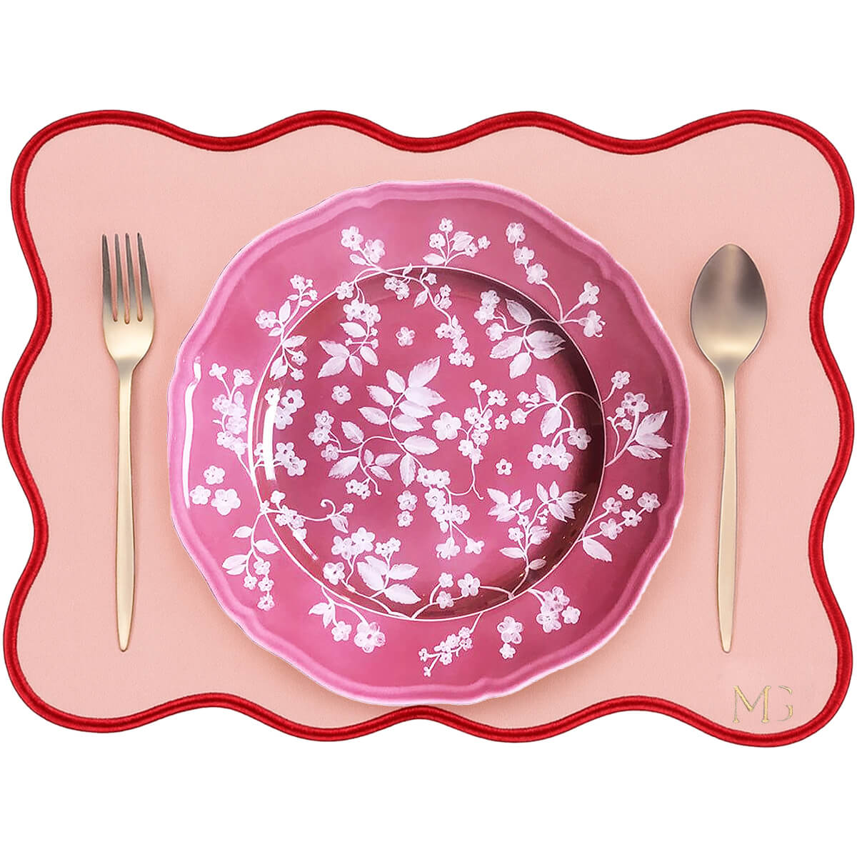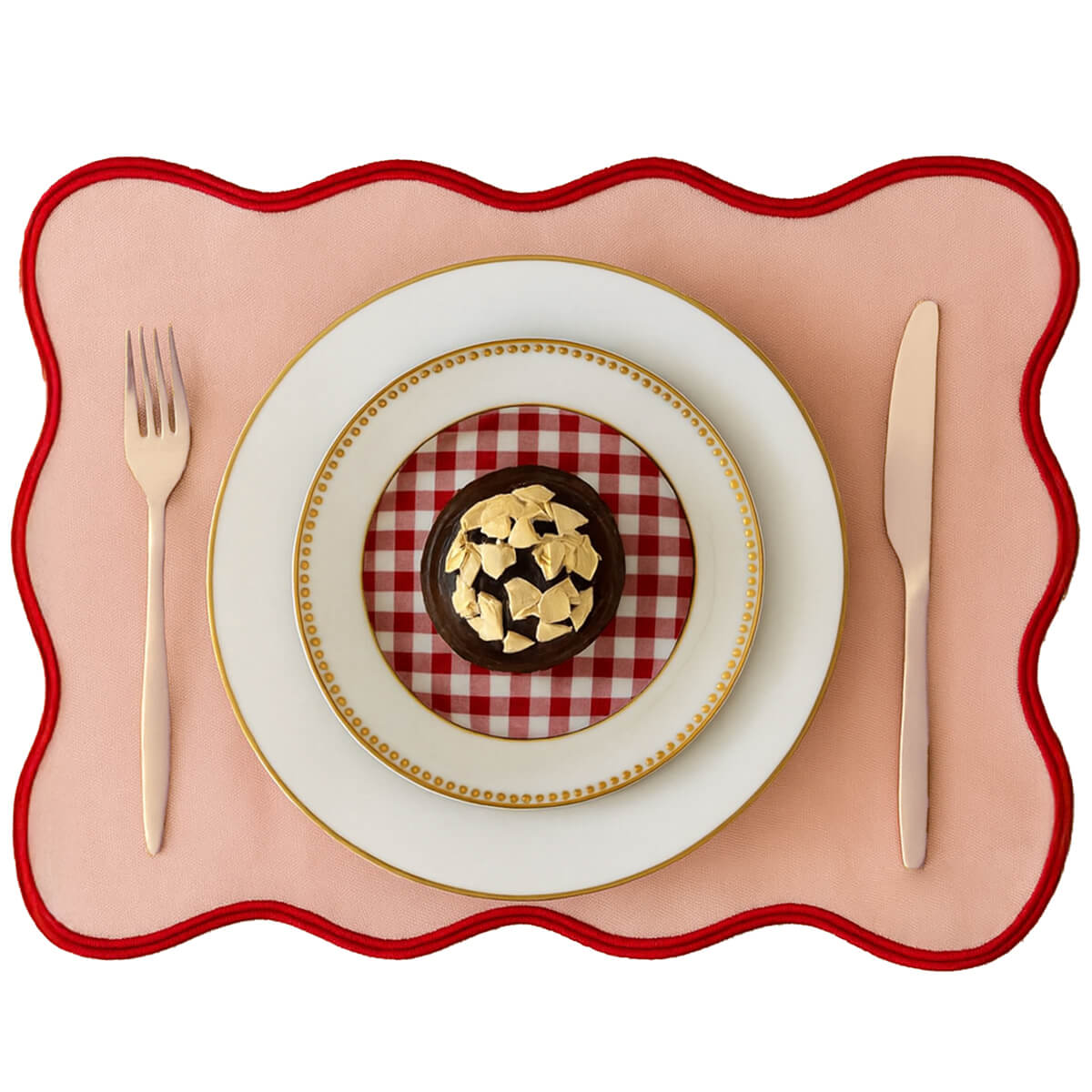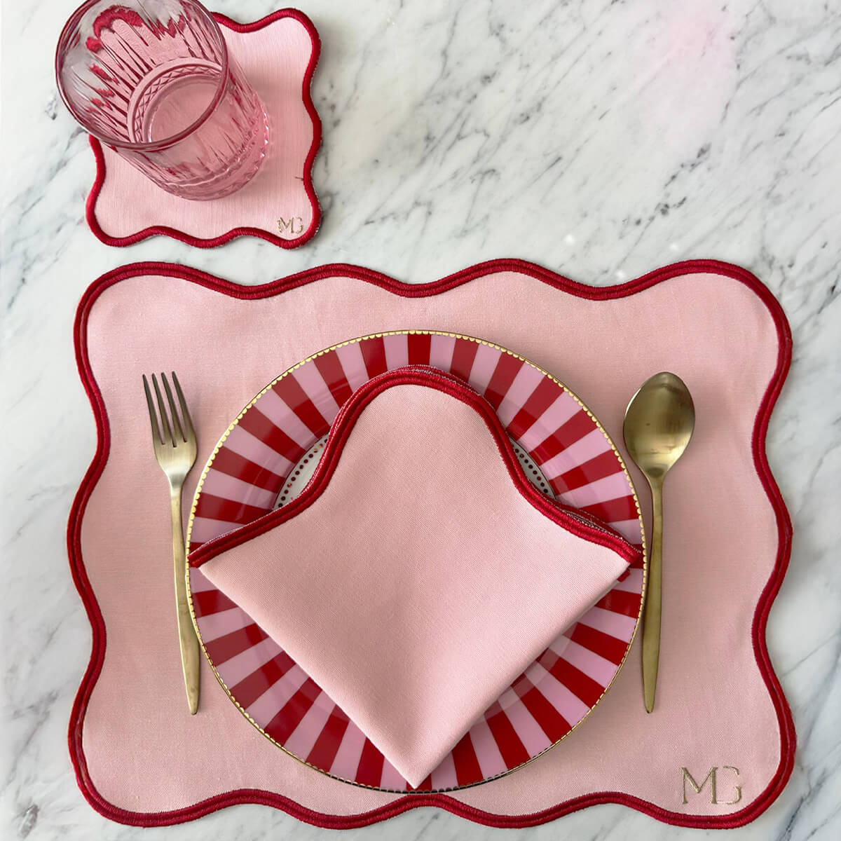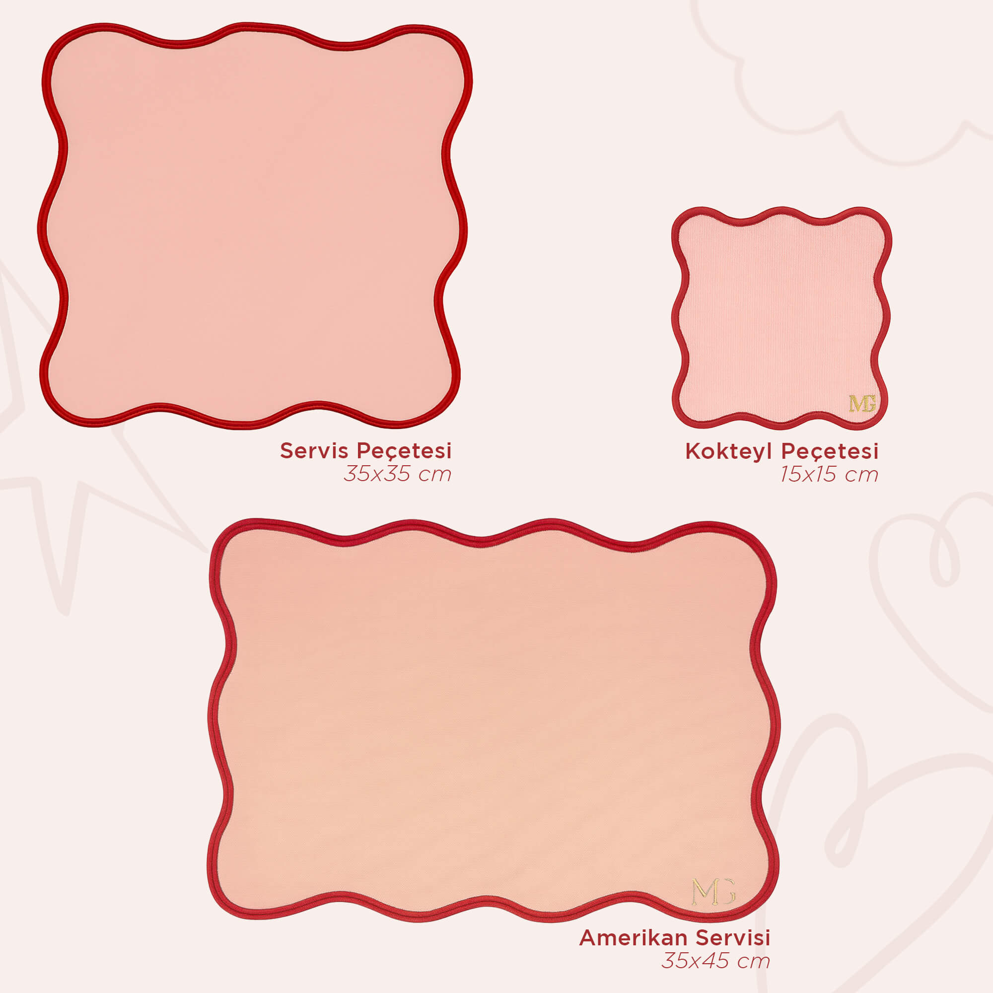 Bu pembe bulut kenar desenli keten Amerikan servis, sadece bir sofra ürünü değil, aynı zamanda yaşam alanlarına estetik bir dokunuş sunan bir dekoratif detaydır. Masalarınıza zarafet, konfor ve şıklık eklemek istiyorsanız, bu tasarım ideal tercihiniz olur.